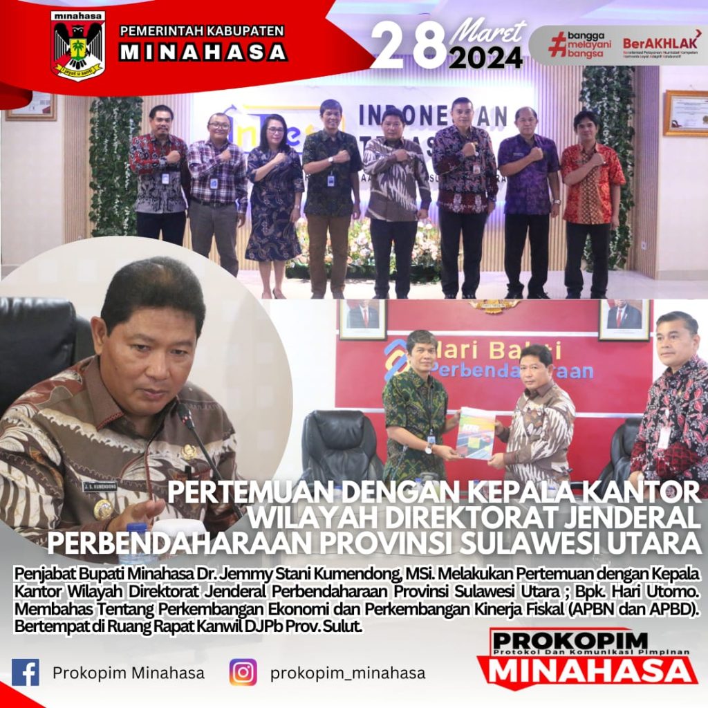 MINAHASA – Penjabat (Pj) Bupati Minahasa, Dr. Jemmy Stani Kumendong, MSI., melaksanakan pertemuan dengan Kepala Kantor Wilayah Direktorat Jenderal Perbendaharaan Provinsi Sulawesi Utara, Hari Utomo, S.E., M.M., Kamis (28/3/2024).