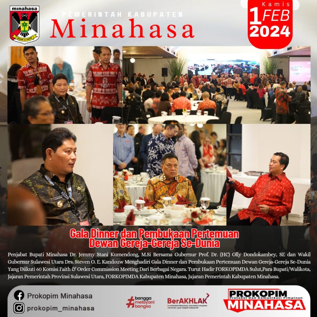 MINAHASA – Penjabat (Pj) Bupati Minahasa Dr. Jemmy Stani Kumendong, M.Si bersama Gubernur, Prof. Dr. (HC) Olly Dondokambey, SE dan Wakil Gubernur Sulawesi Utara (Sulut), Drs. Steven O. E. Kandouw, menghadiri Gala Dinner dan Pembukaan Pertemuan Dewan Gereja-Gereja se- Dunia, bertempat di Yama Resort Tondano, Kamis (1/2/2024).