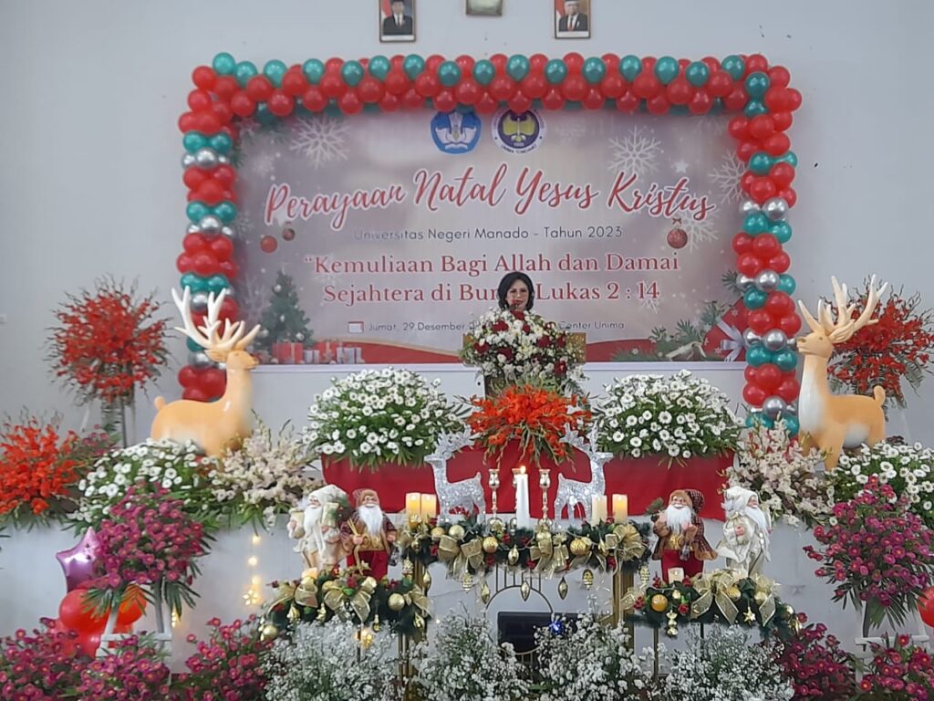 BERITA, MINAHASA – Universitas Negeri Manado (Unima) melaksanakan ibadah perayaan Natal Yesus Kristus, bertempat di gedung Training Center Unima, Jumat, (29/12/2023).