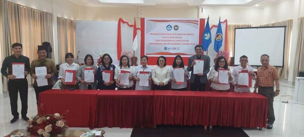MINAHASA UTARA – Universitas Negeri Manado (Unima) menggelar Penandatanganan Perjanjian Kerja, Pakta Integritas dan Sinkronisasi Anggaran Tahun 2024, bertempat Wale Christian Minahasa Utara, Kamis (1/3/2024).